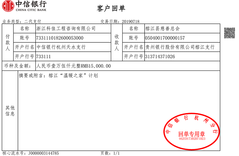 2019年度 榕江县慈善总会温暖之家妄想捐钱15000.00元